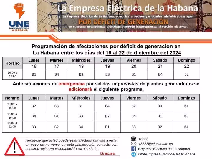 La Empresa Eléctrica de La Habana ha dado a conocer la programación de interrupciones en el servicio eléctrico para la semana del 16 al 22 de diciembre, debido al déficit de generación en las plantas del sistema energético nacional.