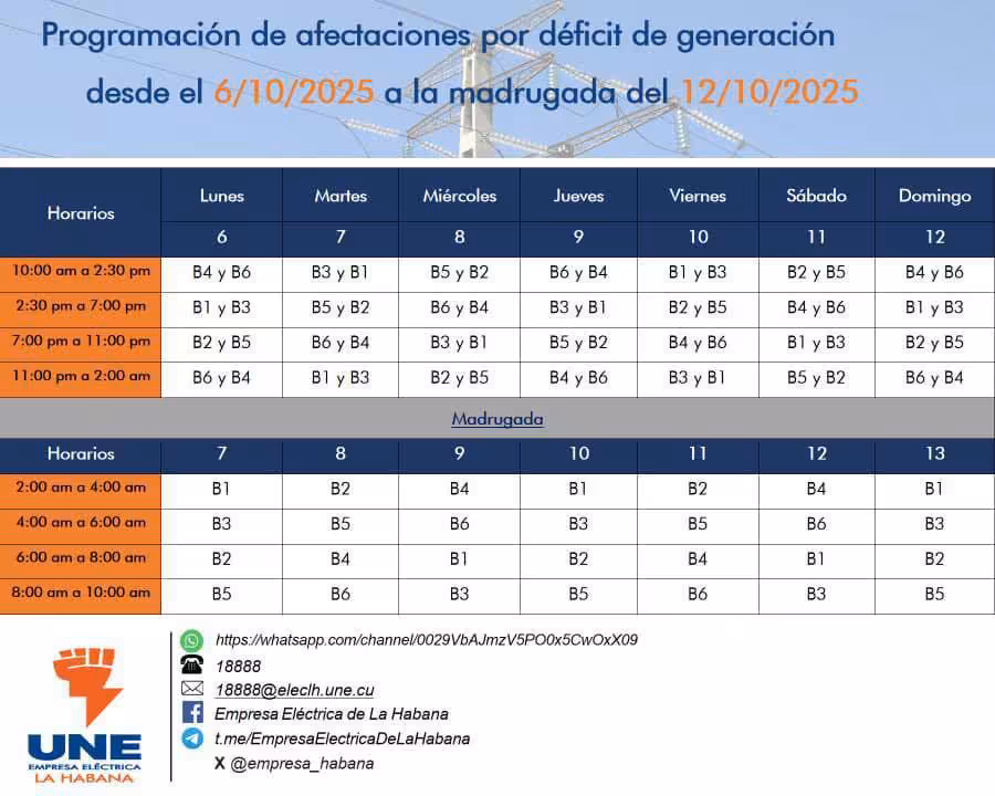 Una nueva semana de apagones llega para los habaneros. La Empresa Eléctrica de La Habana publicó su programación de afectaciones por déficit de generación, vigente desde el lunes 6 hasta la madrugada del domingo 12 de octubre de 2025.