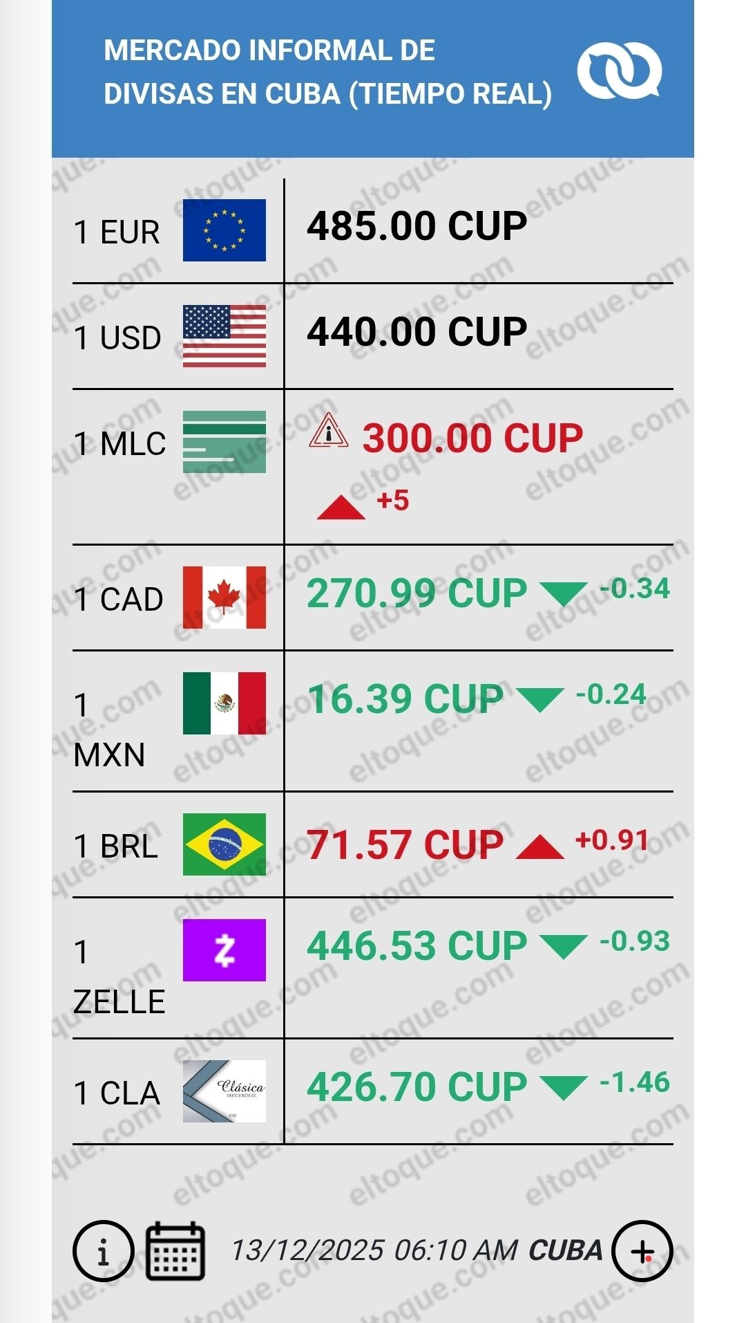 El euro se cotiza hoy en 485 pesos cubanos por unidad. El dólar estadounidense se cambia a 440 pesos cubanos. Por su parte, la Moneda Libremente Convertible se sitúa en 300 pesos cubanos, con un ligero incremento reciente.