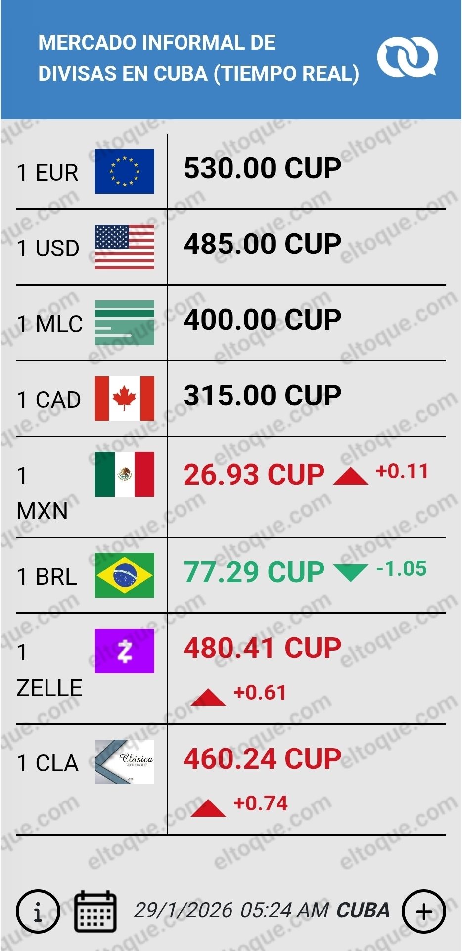 A diferencia del mercado oficial, las tasas del mercado informal no muestran cambios en las últimas 24 horas. Según las referencias más recientes, el dólar se mantiene en 485 pesos cubanos, el euro en 530 pesos cubanos y la MLC en 400 pesos cubanos.