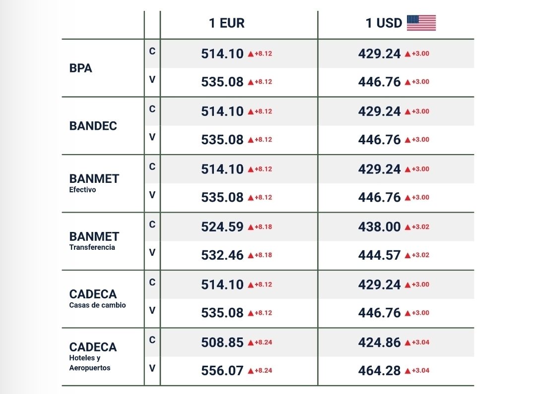 En el sistema bancario cubano y en las Cadecas, los valores para la compra y venta de divisas también reflejan incrementos. Para el dólar y el euro, las tasas muestran subidas similares a las del Banco Central, con ligeras variaciones según la entidad y el tipo de operación.