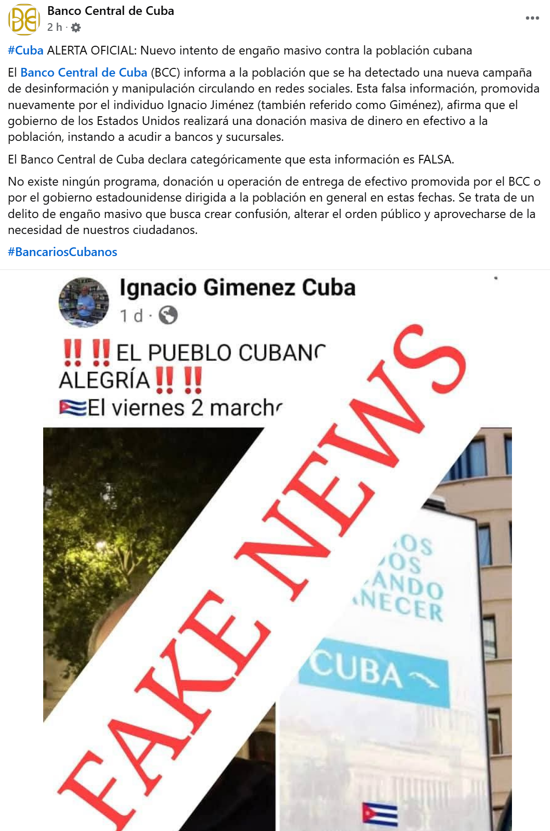 El Banco Central de Cuba informó que detectó una nueva campaña de desinformación dirigida a la población. Según la entidad, el mensaje es falso y no existe ninguna operación de entrega de efectivo vinculada a estas fechas.