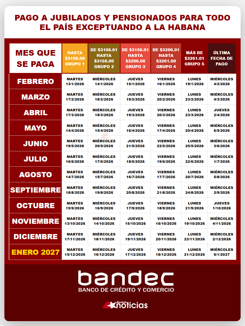 El sistema bancario cubano ya definió el calendario de pago a jubilados y pensionados para 2026. Las fechas fueron publicadas por los tres bancos principales del país y organizan los cobros por grupos, con el objetivo de ordenar el proceso y reducir aglomeraciones.