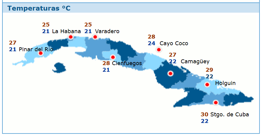 Las temperaturas mostrarán un descenso moderado en el occidente, donde en horas de la tarde los valores oscilarán entre 23 y 26 grados Celsius. En el centro y en el oriente las máximas estarán entre 26 y 29 grados Celsius.