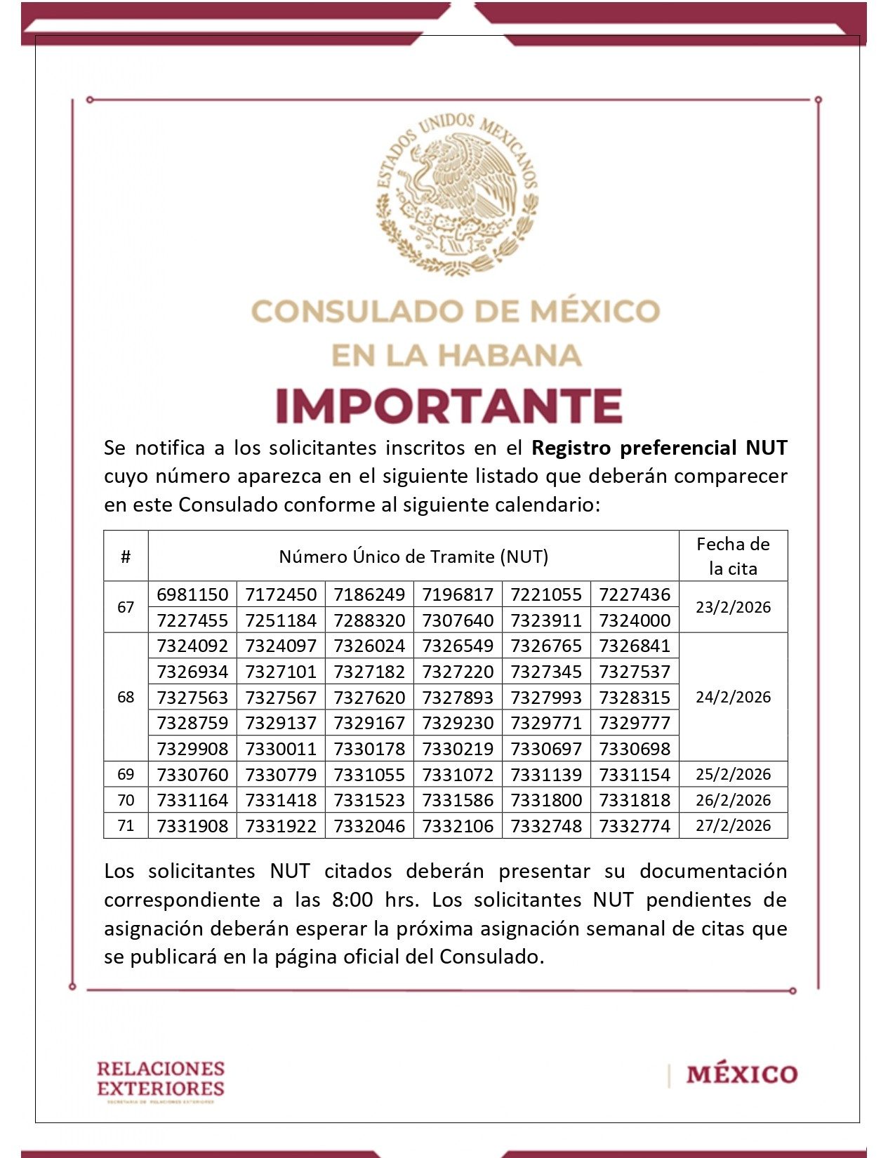 El Consulado recordó que solo deben presentarse quienes aparezcan en el listado. Aquellos números NUT que aún no hayan sido asignados deberán esperar la próxima publicación semanal.