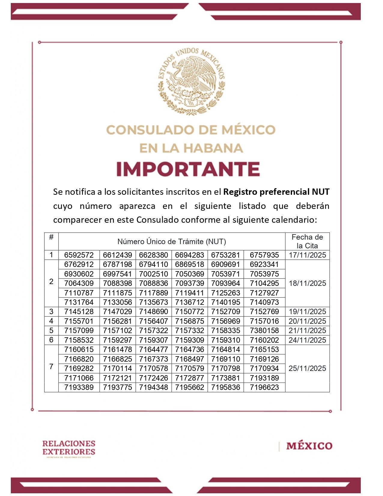 El listado publicado cubre varios días del mes de noviembre. Según los documentos difundidos, los solicitantes deberán presentarse en el consulado a las ocho de la mañana en la fecha indicada junto a su NUT. Las jornadas de atención anunciadas van del 17 al 28 de noviembre e incluyen números que comienzan desde el rango 6592572 hasta 7219753. Las tablas muestran diez bloques con grupos de NUT asignados a cada día.