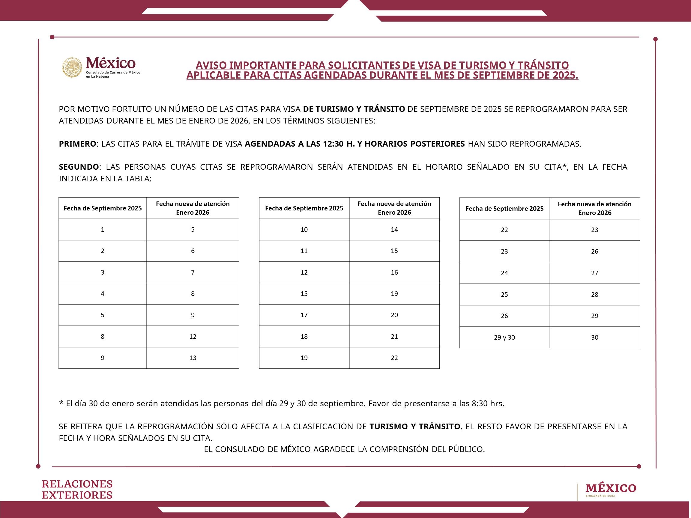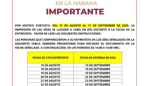 Atención para todas las personas solicitantes de visa. pic.twitter.com/2OY8GU5pES— Consulado de México en La Habana (@ConsulMexLH) August 26, 2025