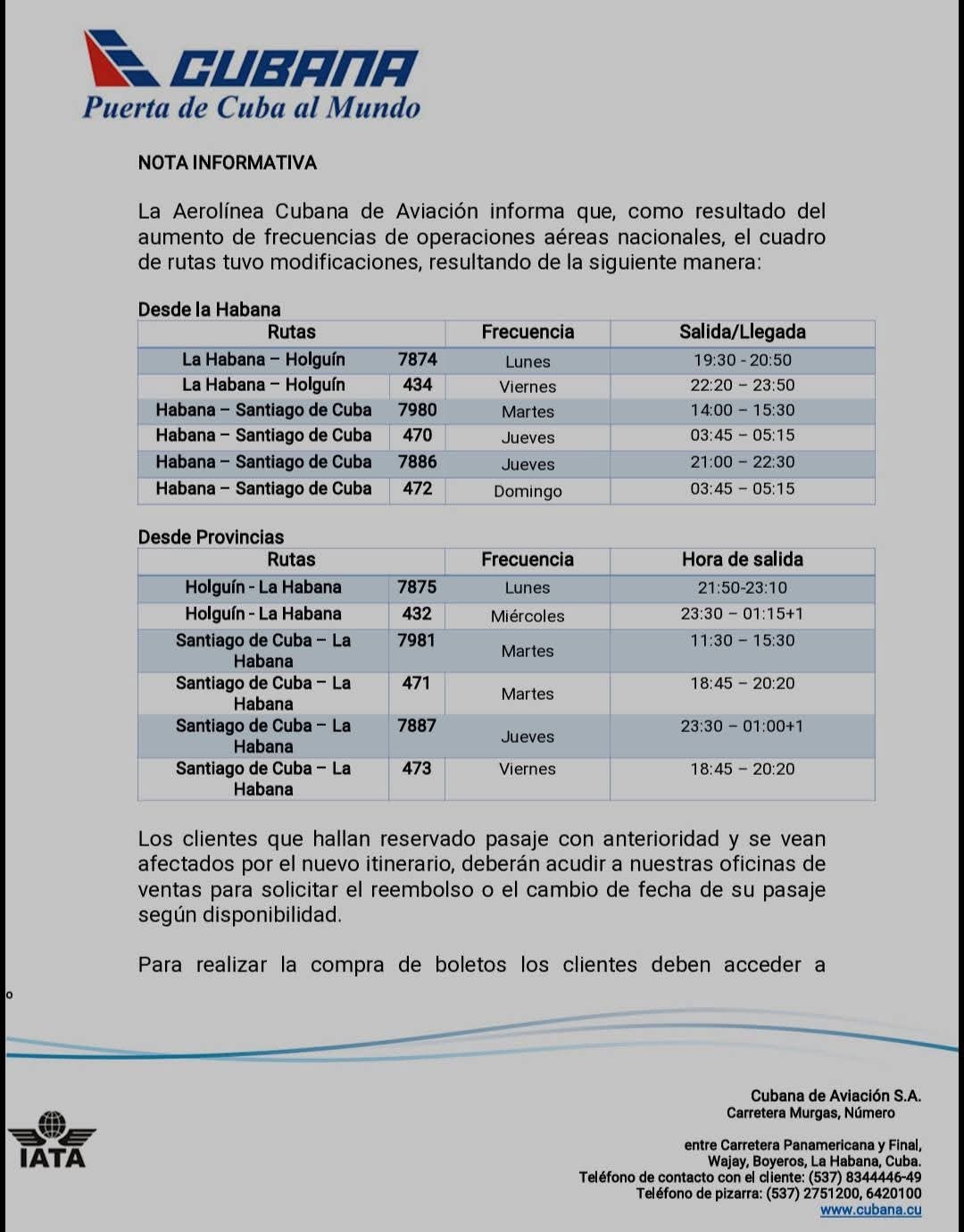 Empresa Cubana de Aviación S.A. indicó que lamenta los inconvenientes que estos ajustes puedan causar a los clientes y aseguró que las modificaciones responden al incremento de operaciones dentro del país.