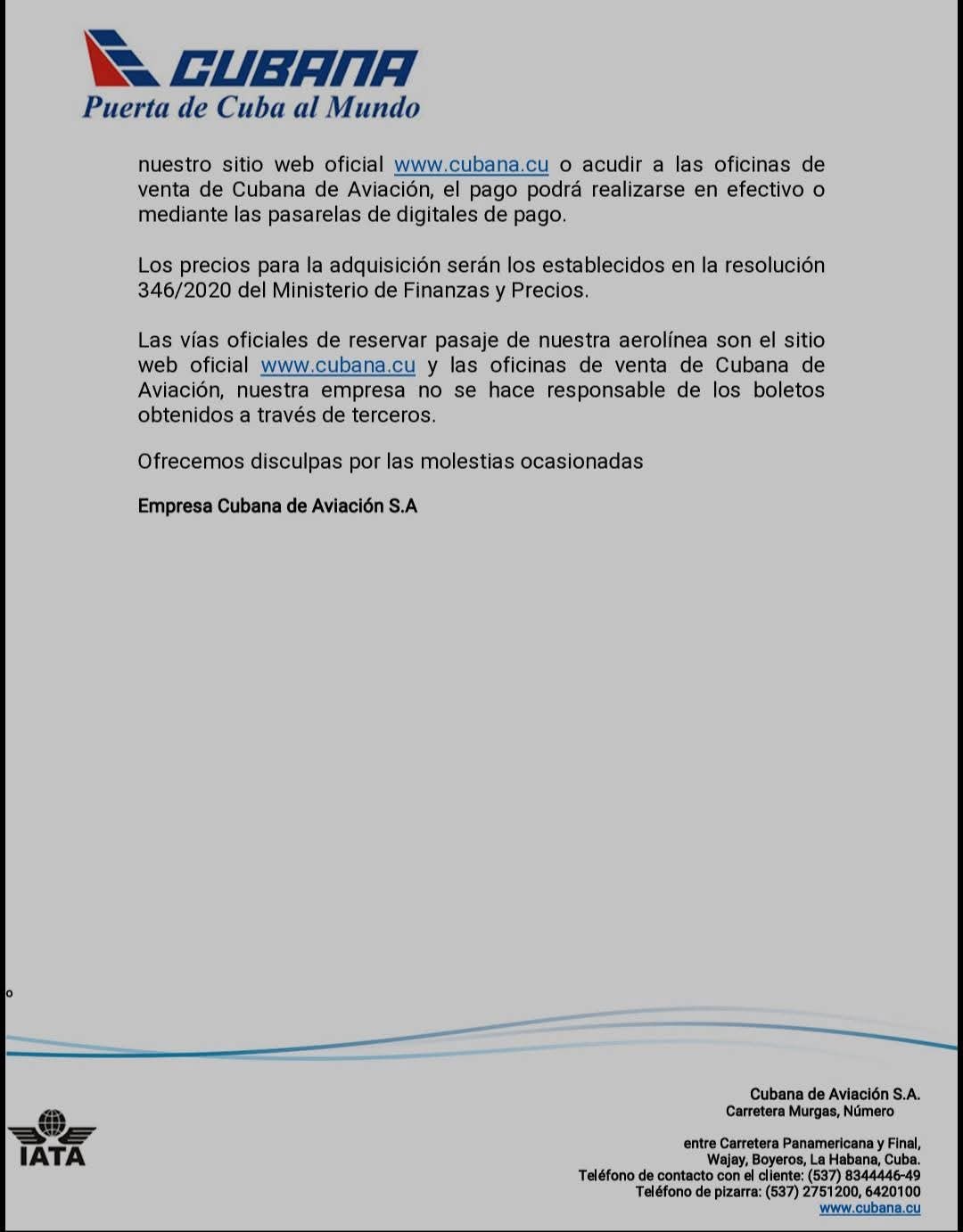 La aerolínea recordó que la compra oficial de boletos solo puede realizarse en su sitio web www.cubana.cu o directamente en las oficinas comerciales.