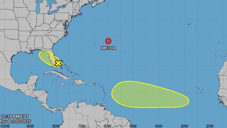 Por otra parte, el huracán Imelda, que llegó a tener vientos de 120 km/h, se debilitó y ahora es un ciclón extratropical. A las 11:00 a.m. de este jueves se localizaba a 505 km al este-noreste de las Bermudas, moviéndose a 46 km/h hacia el este-noreste.