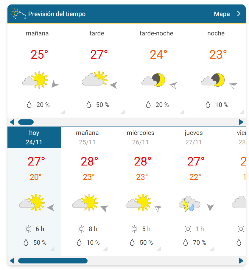 Las temperaturas mínimas oscilarán entre los 18 y 21 grados Celsius. En zonas montañosas y áreas del interior occidental podrían ser inferiores. Para la tarde, las máximas subirán hasta valores entre 27 y 30 grados Celsius, algo superiores en zonas alejadas de la costa.