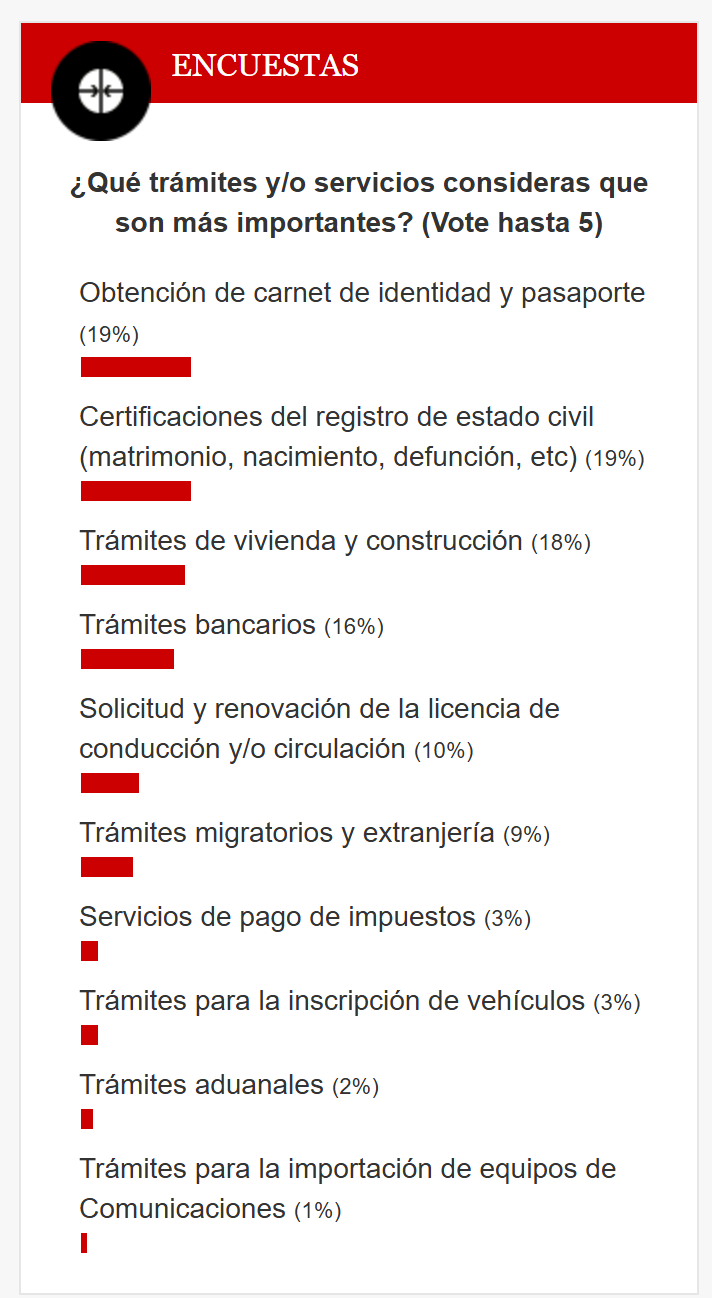 La consulta preguntó: ¿Qué trámites y/o servicios consideras que son más importantes? Entre las opciones, la obtención del carnet de identidad y pasaporte encabezó la lista con un 19%. Con el mismo porcentaje aparecieron las certificaciones del registro civil (matrimonio, nacimiento, defunción, etc.), seguidas por los trámites de vivienda y construcción (18%).