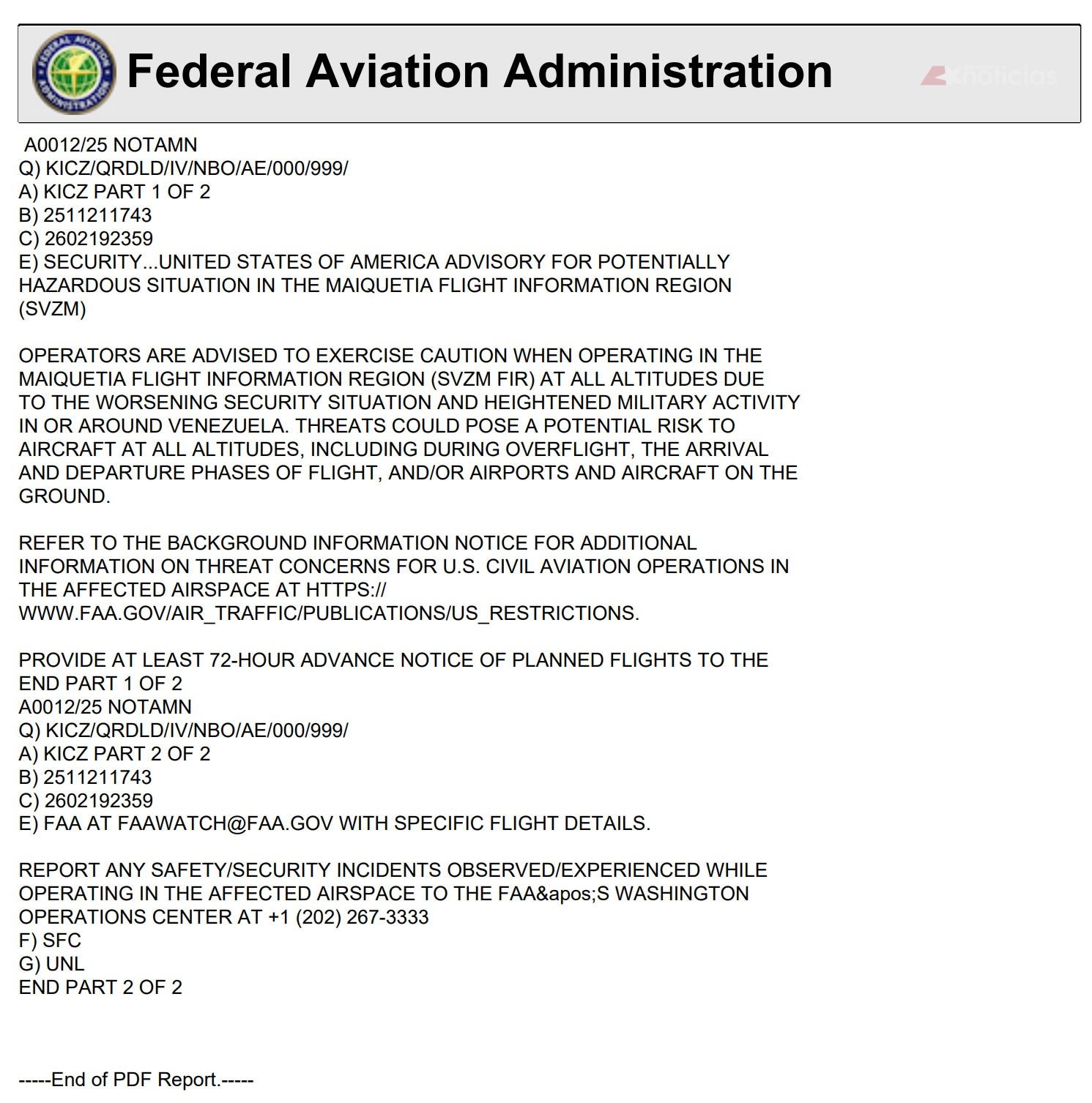 Las notificaciones de riesgo fueron publicadas a través de un aviso NOTAM que abarca tanto el territorio venezolano como zonas marítimas del sur del Caribe. Este tipo de alertas obliga a los operadores estadounidenses a extremar precauciones y revisar procedimientos antes de ingresar a la región.