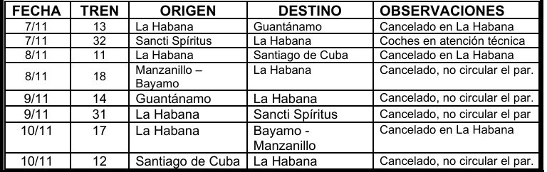 La Unión de Ferrocarriles de Cuba confirmó que se mantienen canceladas las salidas de los trenes nacionales debido a los daños ocasionados por el huracán en las provincias de Holguín, Granma, Santiago de Cuba y Guantánamo.