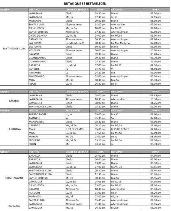 Entre las rutas restablecidas figuran las de Santiago de Cuba hacia La Habana, Matanzas, Santa Clara, Camagüey, Holguín, Bayamo y Guantánamo, además de trayectos desde Baracoa y Bayamo hacia la capital. También se reactivan viajes interprovinciales entre ciudades orientales como Manzanillo, Moa y Pilón.