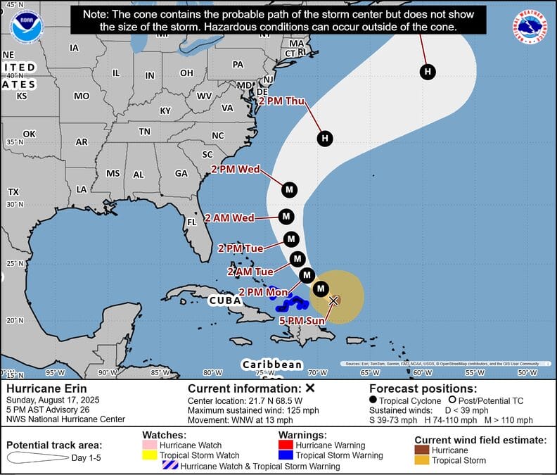 Además, los vientos con fuerza de tormenta tropical alcanzan un radio de más de 300 kilómetros desde el centro del ciclón. Las marejadas generadas por Erin continuarán afectando durante varios días a Puerto Rico, Hispaniola y las Islas Vírgenes, y se extenderán progresivamente hacia las Bahamas, las Bermudas, la costa este de Estados Unidos y Canadá.