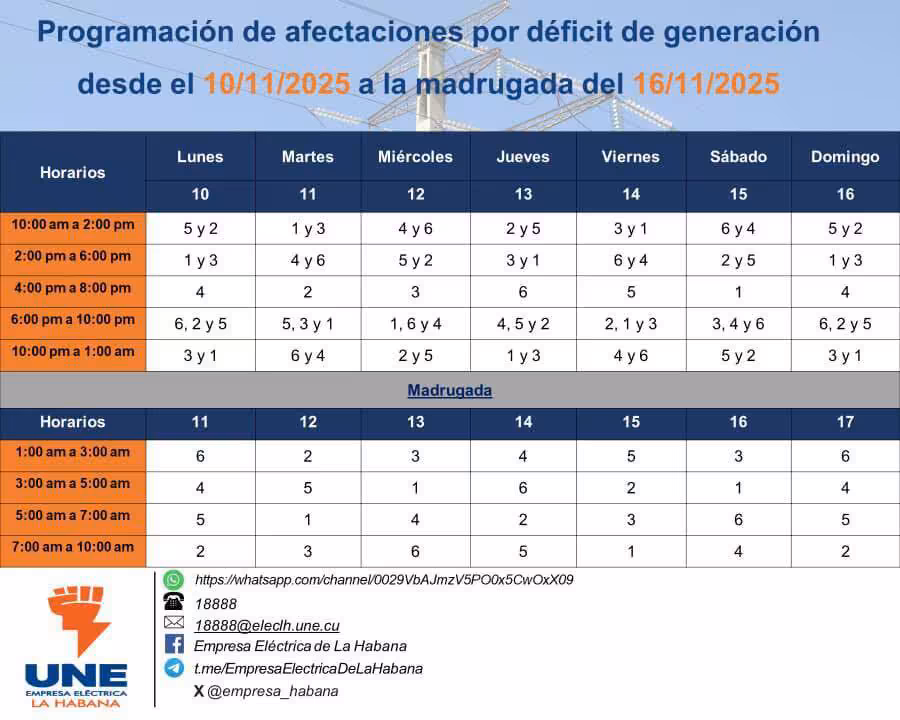 Durante las madrugadas, los cortes continuarán entre la 1:00 a.m. y las 7:00 a.m., afectando en distintos días a los bloques 2, 3, 4, 5 y 6. Esta programación coincide con los periodos de menor demanda, una medida adoptada por la Unión Eléctrica (UNE) para equilibrar la carga y evitar colapsos mayores.