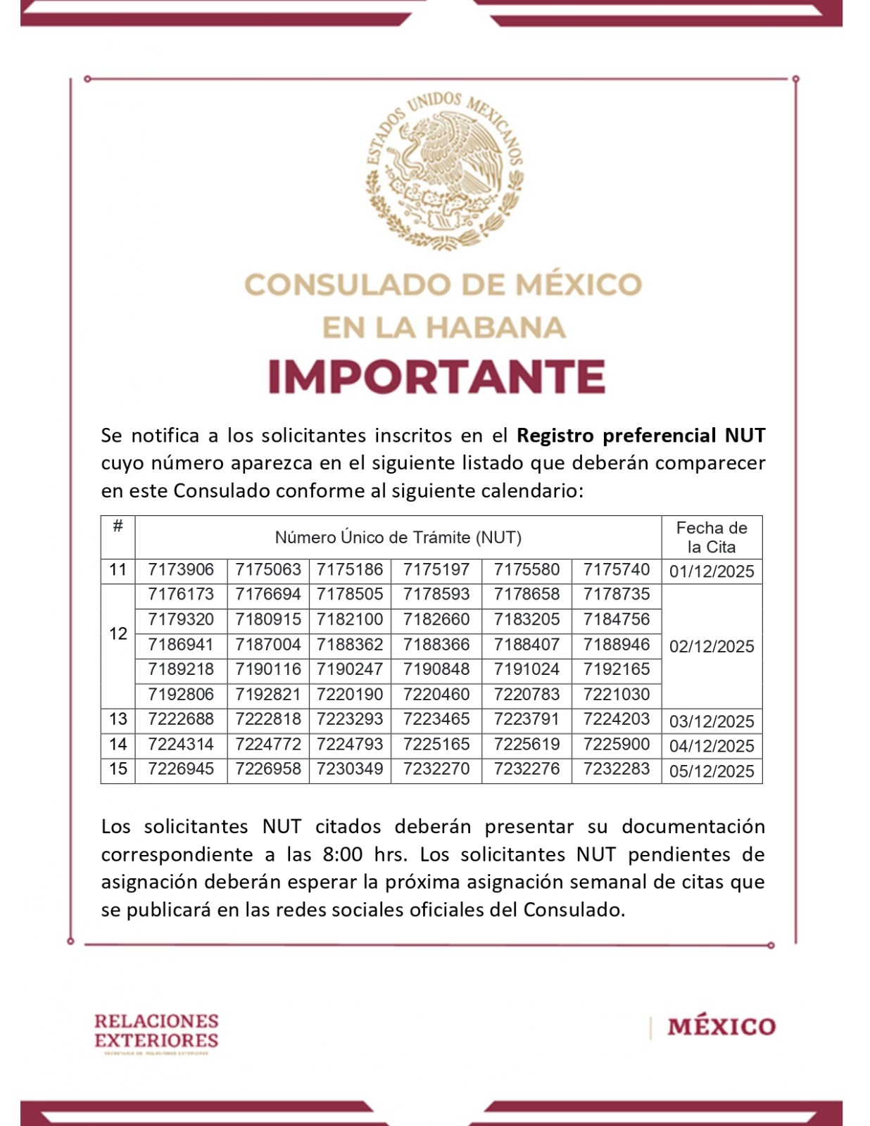 En un segundo aviso, el Consulado publicó el listado actualizado de solicitantes inscritos en el Registro Preferencial NUT que deberán presentarse en la primera semana de diciembre de 2025.