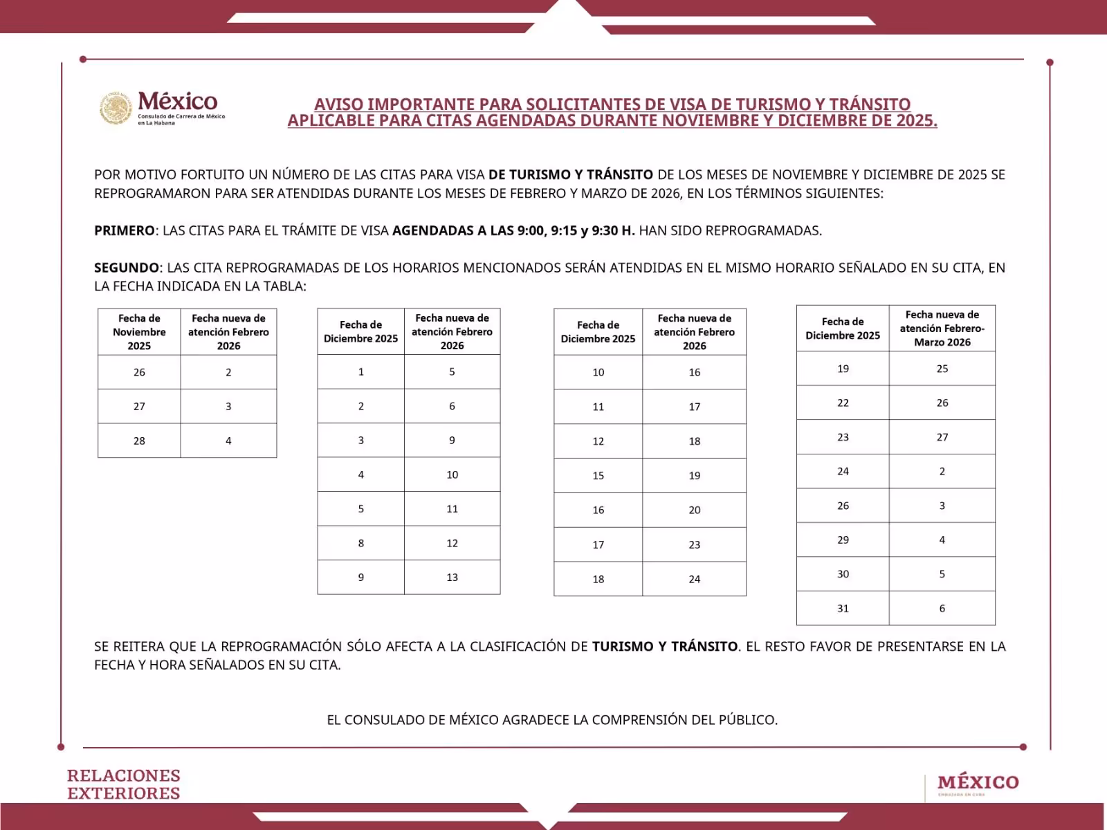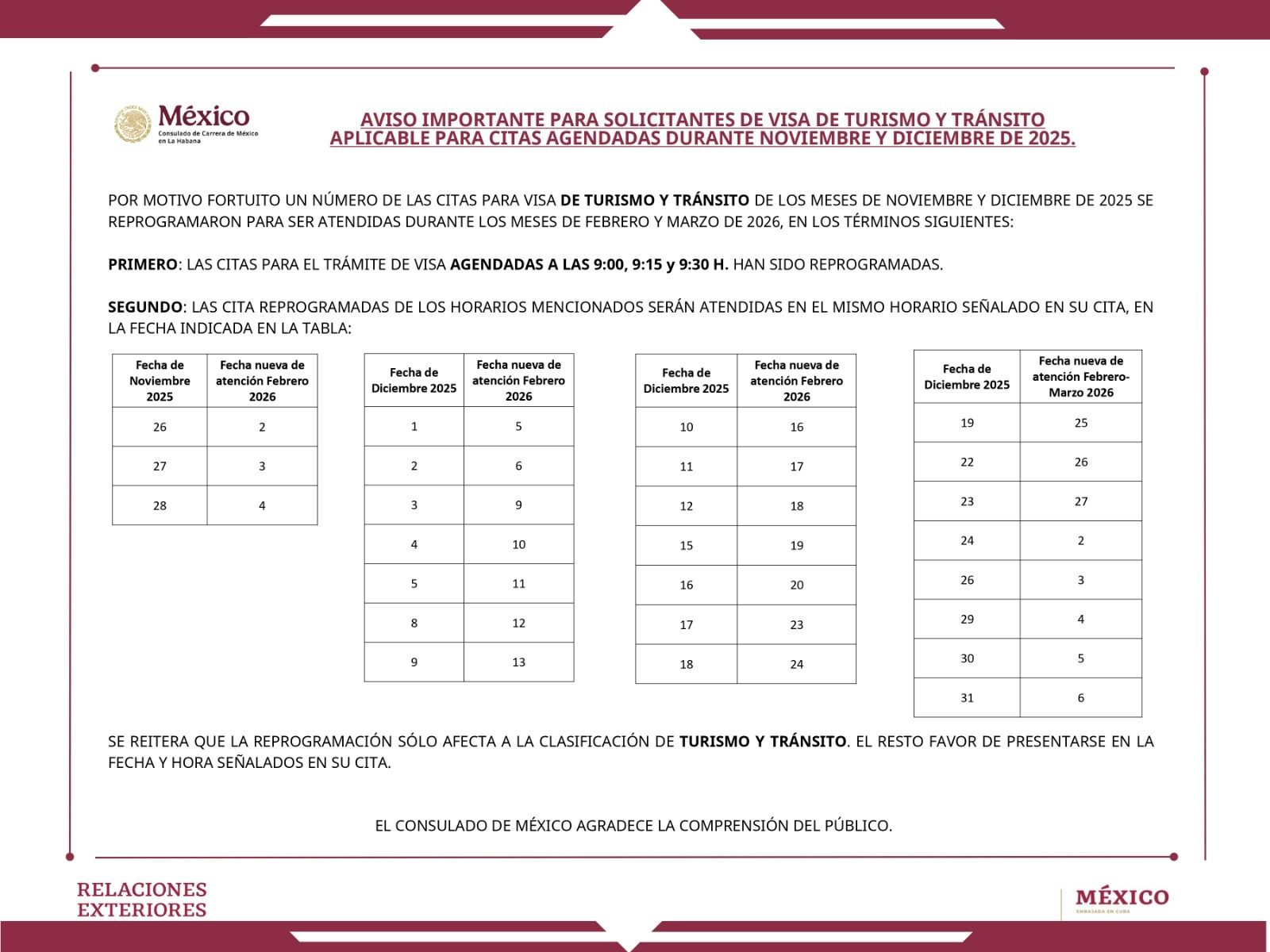 El Consulado de México en La Habana emitió dos avisos que afectan a quienes tenían citas previstas para finales de 2025. Los mensajes incluyen modificaciones que impactan tanto a solicitantes de visa como a quienes se inscribieron en el registro NUT.
