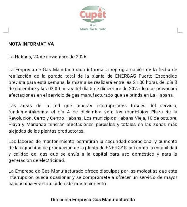 Ante este escenario, los usuarios que dependen del gas manufacturado en La Habana deberían tomar previsiones. Resulta aconsejable organizar con antelación la preparación de alimentos para los días 3, 4 y 5 de diciembre y disponer, si es posible, de alternativas para cocinar.