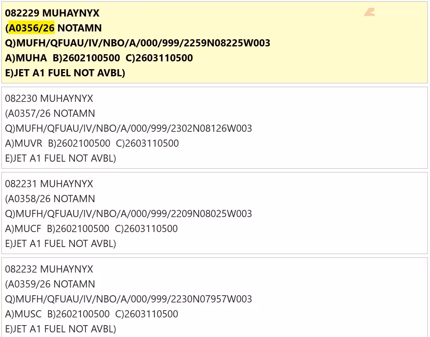 Los NOTAM publicados reflejan de manera explícita la falta de combustible para aviación en casi todo el país. Las notas fueron emitidas de forma consecutiva y abarcan los principales aeropuertos internacionales.
