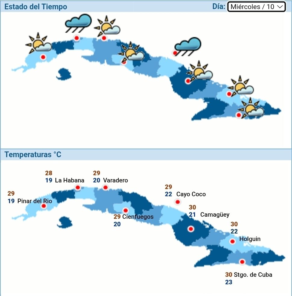 Según el Centro de Pronósticos del Tiempo del INSMET, la jornada de este 10 de diciembre se presenta con un cielo parcialmente nublado en la región occidental y central. En áreas cercanas a la costa podrían ocurrir chubascos esporádicos, aunque de corta duración.