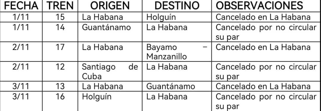 Los trenes nacionales y locales de pasajeros continúan cancelados hacia el oriente del país. Equipos de la Unión de Ferrocarriles de Cuba inspeccionan los tramos dañados, especialmente en Holguín, Granma, Santiago de Cuba y Guantánamo, y avanzan en la reparación de los más afectados.
