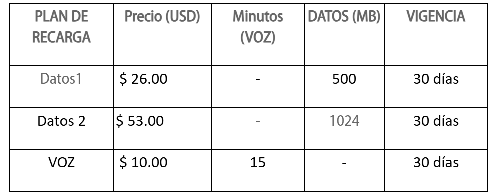 La recarga de datos de 500 megabytes cuesta 26 dólares. La de 1024 megabytes tiene un precio de 53 dólares. La recarga de voz incluye 15 minutos por 10 dólares.