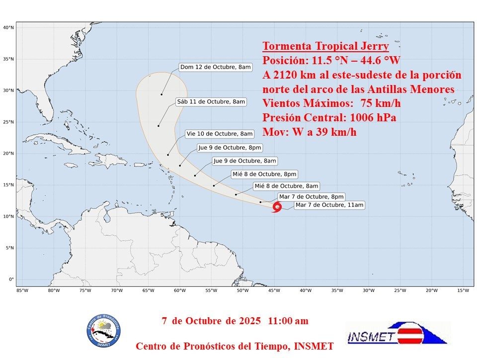 Según el Centro de Pronósticos del Instituto de Meteorología (INSMET), la Tormenta Tropical Jerry se localizaba a las once de la mañana de este martes en los 11.5 grados de latitud Norte y 44.6 grados de longitud Oeste. Esta posición la ubica a unos 2120 kilómetros al este-sudeste del arco norte de las Antillas Menores. Jerry se mueve al oeste a 39 kilómetros por hora, con vientos máximos sostenidos de 75 kilómetros por hora. Tiene una presión central de 1006 hectoPascal.