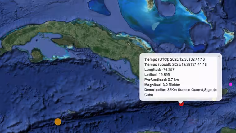 El evento ocurrió a las 2:41 de la madrugada, hora universal coordinada, lo que corresponde a las 9:41 de la noche del 29 de diciembre en Cuba.