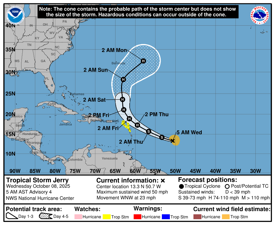 Según el Centro Nacional de Huracanes de Estados Unidos (NHC), la Tormenta Tropical Jerry se localizaba a las 5:00 de la mañana de este miércoles 8 de octubre en los 13.3 grados de latitud norte y 50.7 grados de longitud oeste, a unos 1435 kilómetros al este-sureste de las Islas de Sotavento. Presenta vientos máximos sostenidos de 85 kilómetros por hora y una presión central mínima de 1003 hectoPascal, desplazándose al oeste-noroeste a 37 kilómetros por hora.