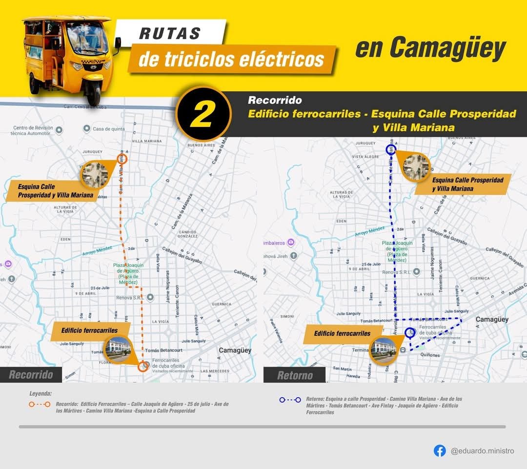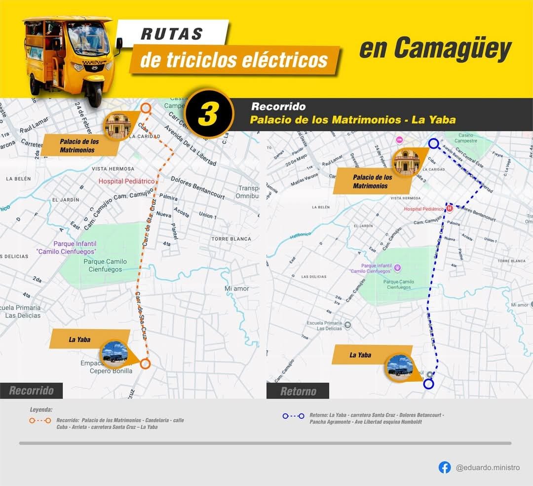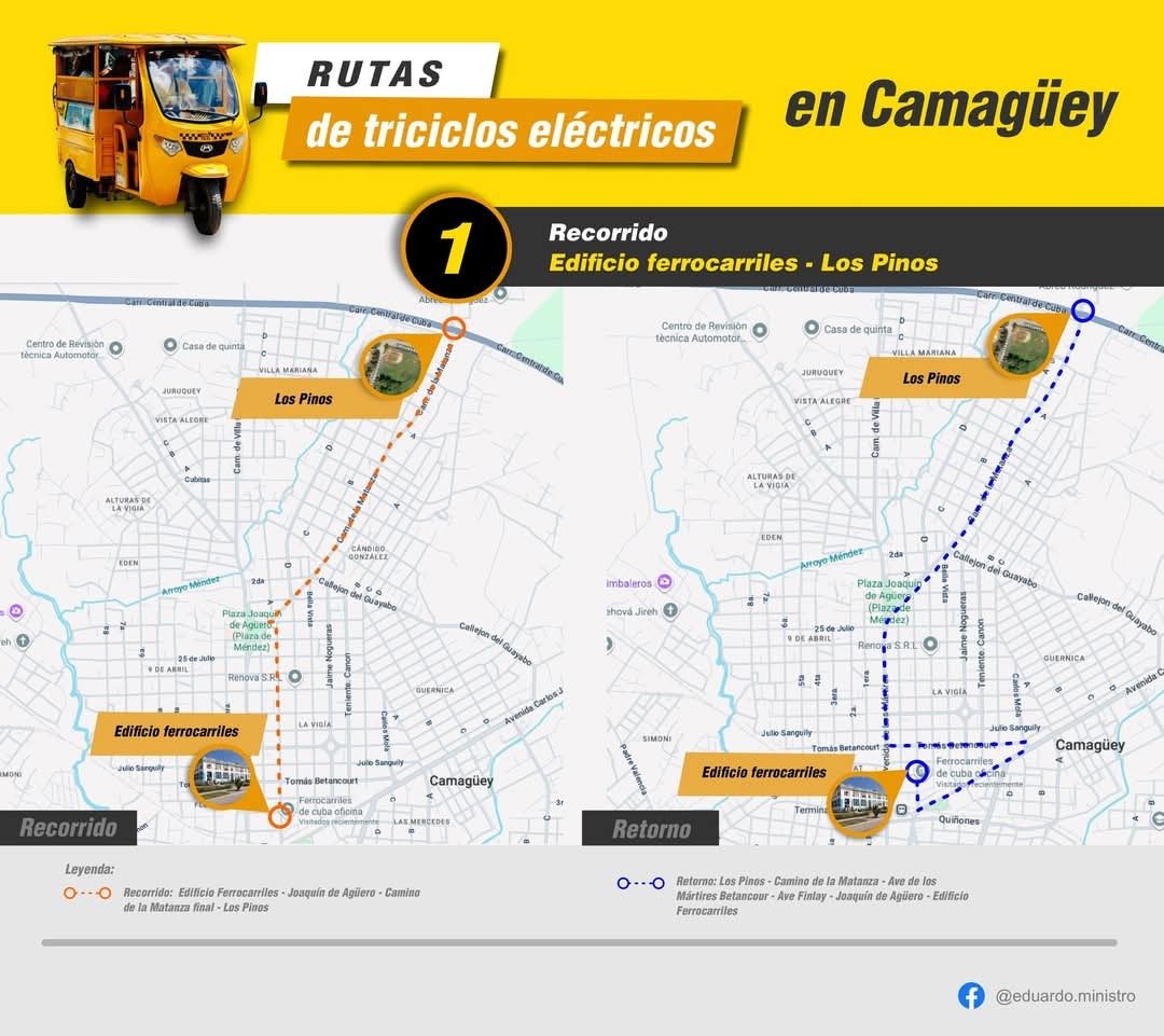 Desde el 7 de septiembre de 2025 operan en la ciudad 15 triciclos eléctricos distribuidos en tres rutas principales. La primera conecta el Edificio de Ferrocarriles con Los Pinos, la segunda enlaza el mismo punto con Villa Mariana, y la tercera recorre desde el Palacio de los Matrimonios hasta el barrio de La Yaba. Cada una de ellas dispone de cinco vehículos asignados.