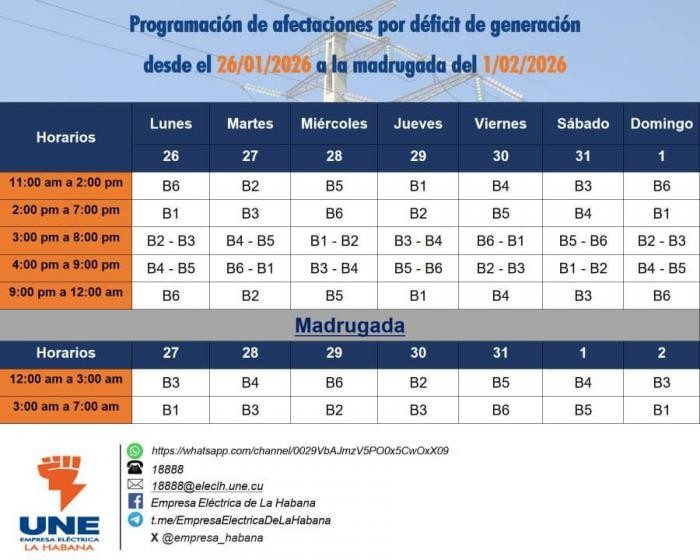 Empresa Eléctrica de La Habana anunció los horarios de apagones desde hoy hasta el 1 de febrero. Todos los detalles de inmediato. La Empresa Eléctrica de La Habana informó la programación de afectaciones al servicio eléctrico debido al déficit de generación, previstas desde el lunes 26 de enero hasta la madrugada del sábado 1 de febrero de 2026.