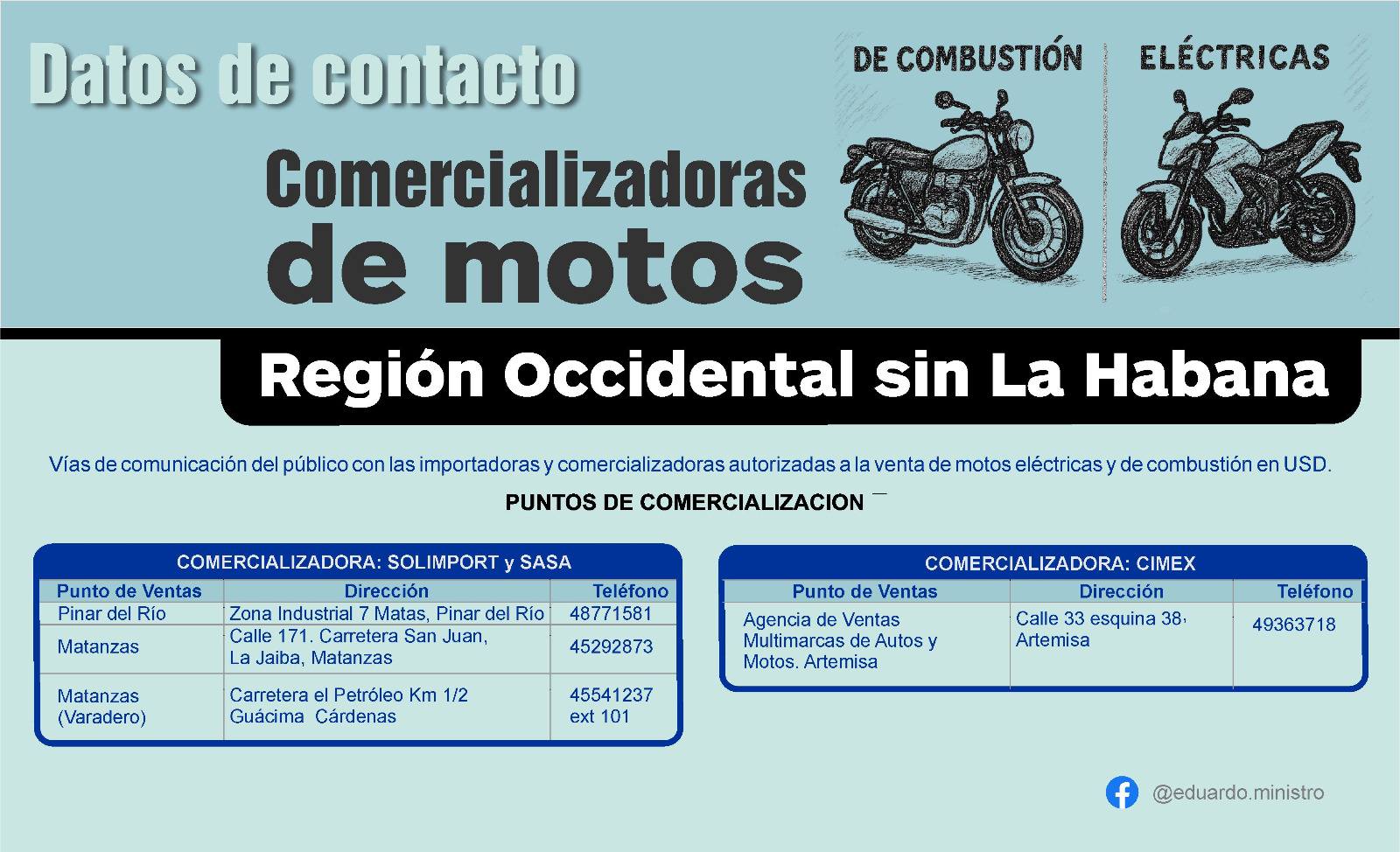 En la Región Occidental, sin incluir La Habana, los puntos de comercialización se concentran en Pinar del Río, Matanzas, Varadero y Artemisa. Las entidades encargadas son Solimport, SASA y CIMEX, que disponen de oficinas y números telefónicos para la atención al público.