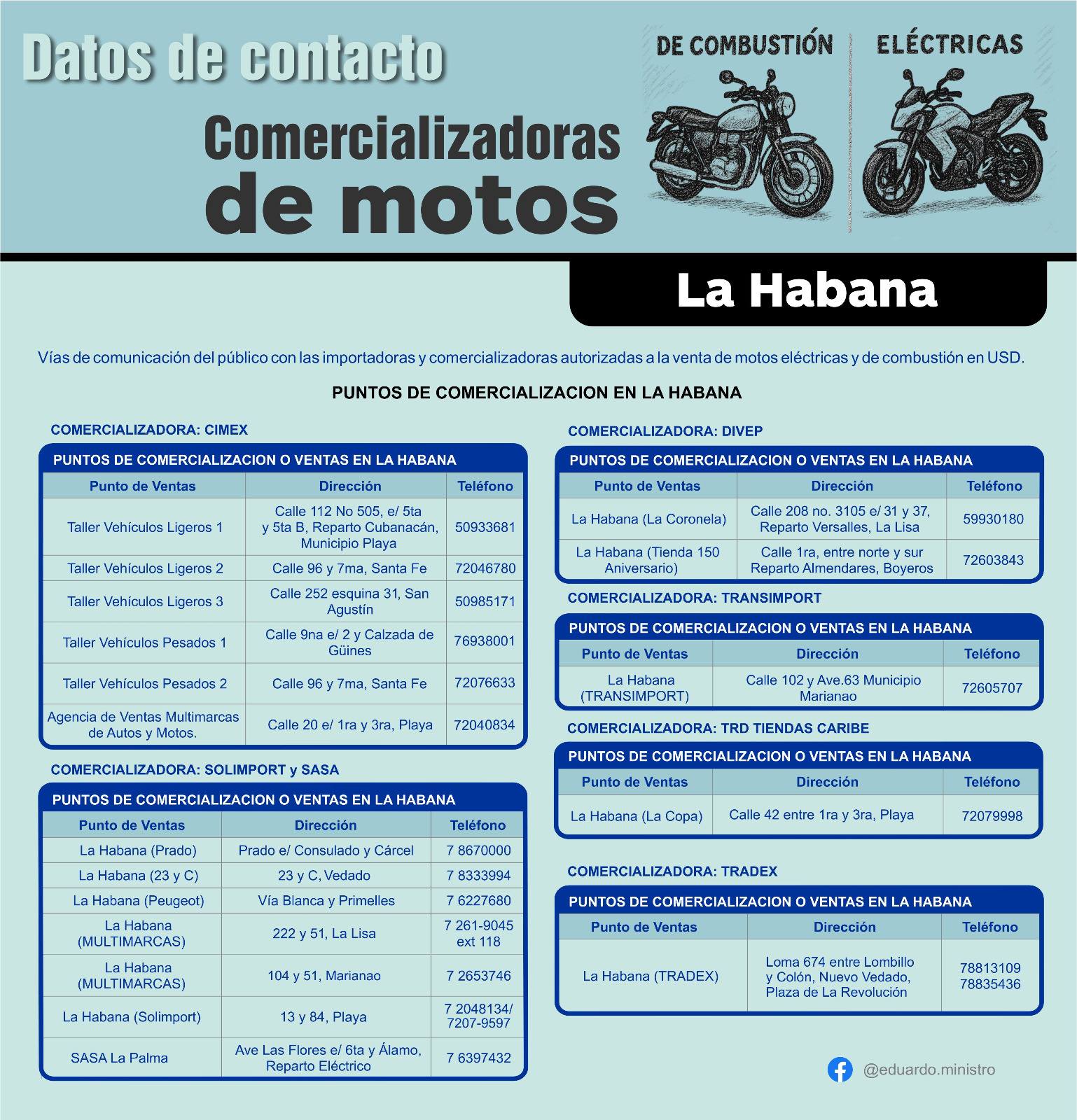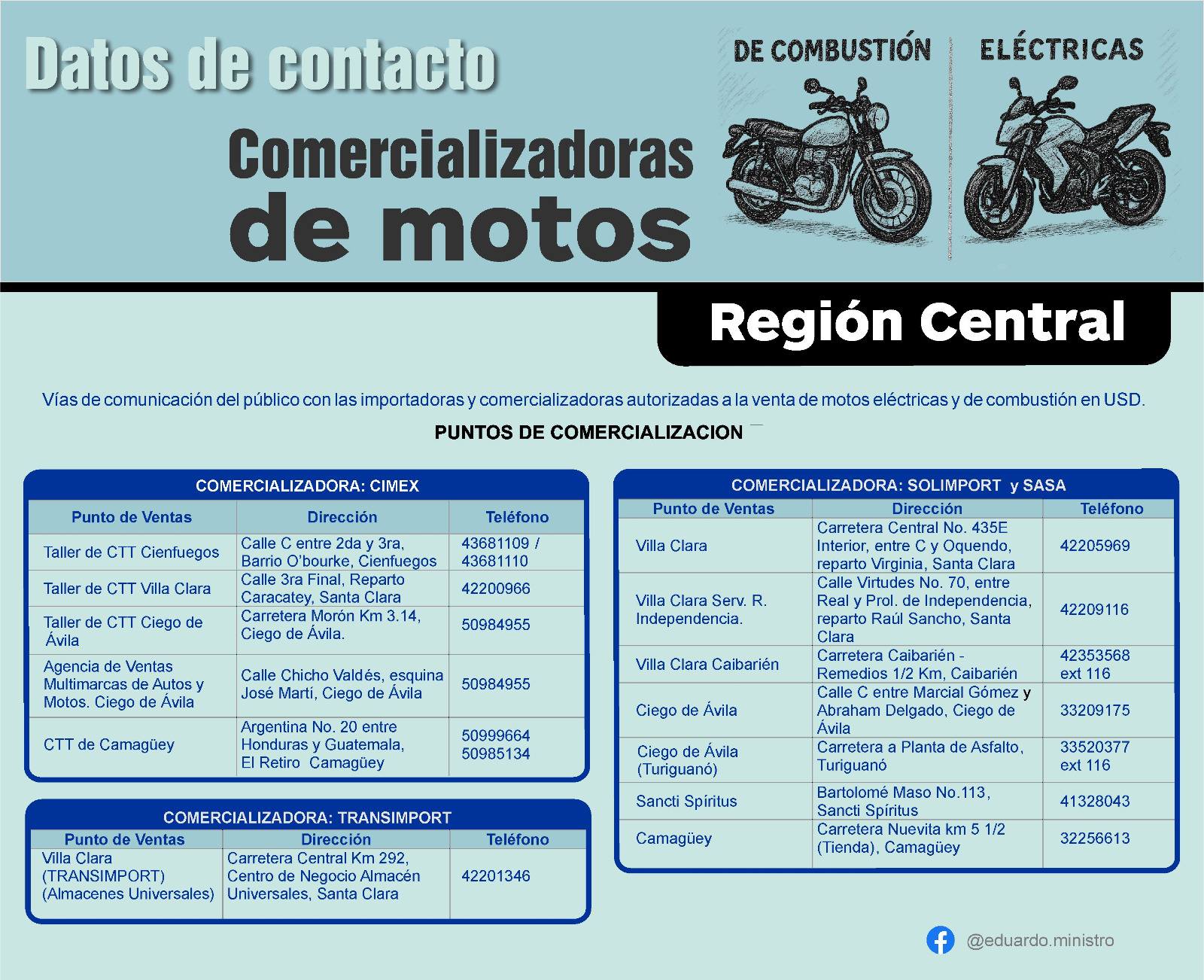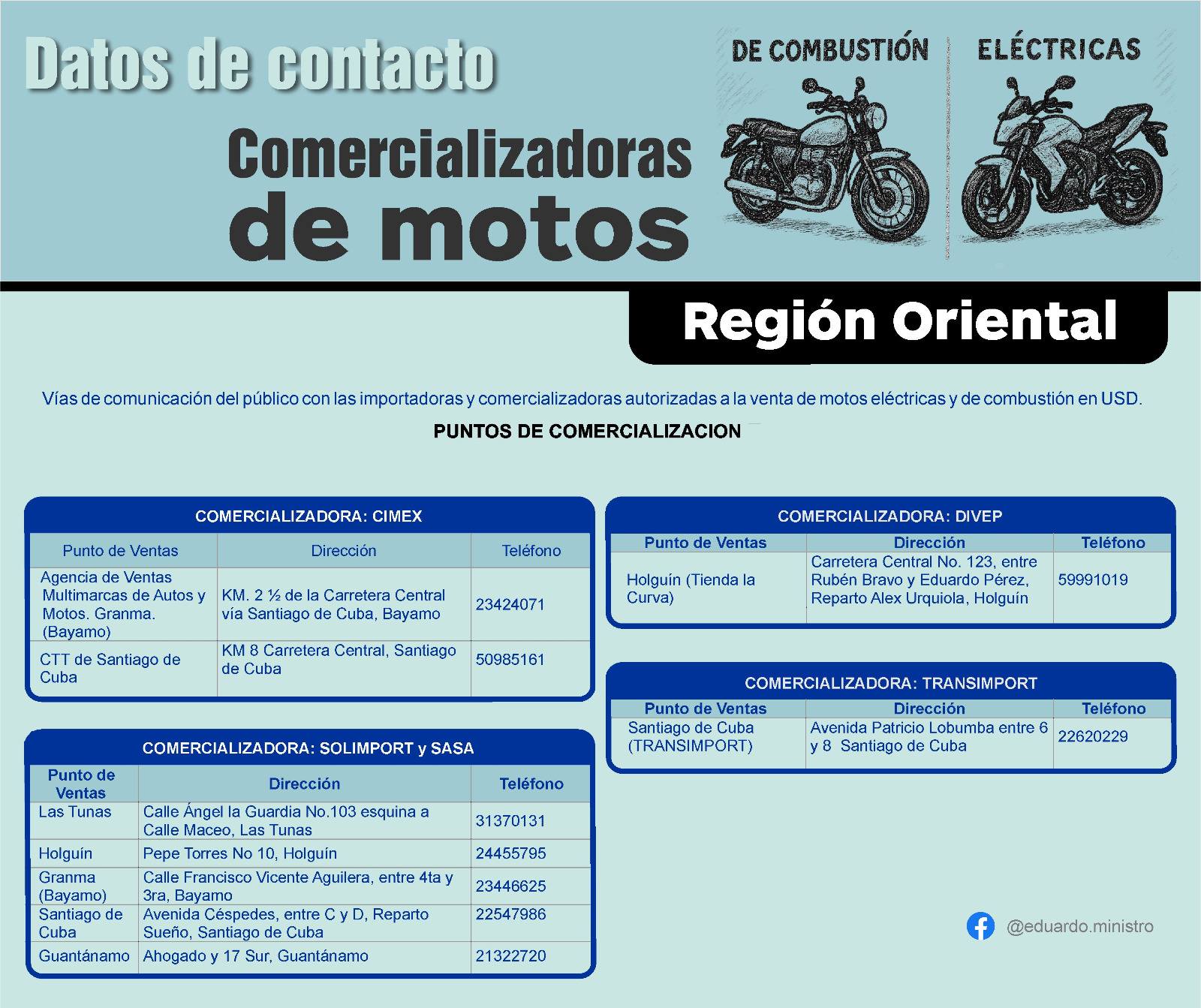 Mientras tanto, en la Región Oriental, los puntos de venta se encuentran en Holguín, Las Tunas, Bayamo, Santiago de Cuba y Guantánamo. En este territorio participan varias entidades, entre ellas CIMEX, Solimport-SASA, DIPEV y TRANSPORT, ampliando así las posibilidades para los interesados en adquirir un ciclomotor o motocicleta.