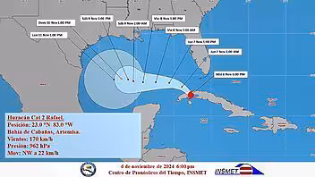 El Centro de Pronósticos del Instituto de Meteorología de Cuba (INSMET) ha emitido el Aviso de Ciclón Tropical No. 13 para informar sobre la trayectoria y el impacto del huracán Rafael, actualmente ubicado sobre la bahía de Cabañas, en la provincia de Artemisa.