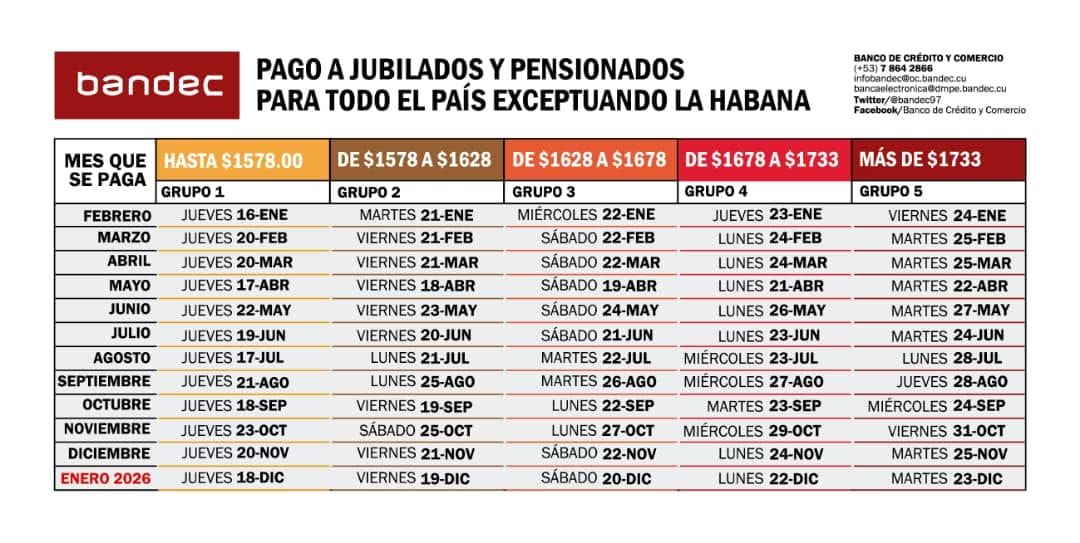 Calendario de pago a los jubilados del Banco de Crédito y Comercio (BANDEC) 2025