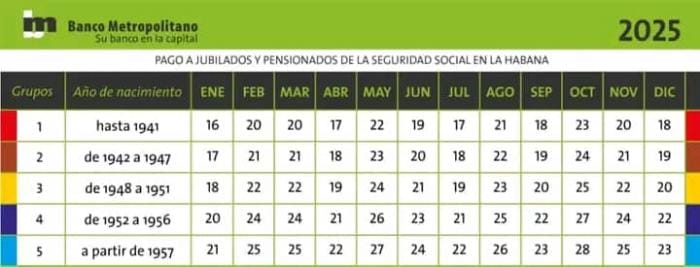 Calendario de pago a los jubilados del Banco Metropolitano de La Habana 2025