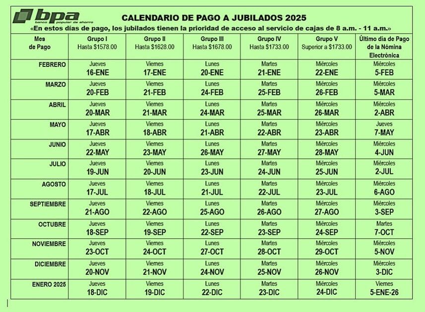 Calendario de pago a los jubilados del Banco Popular de Ahorro 2025