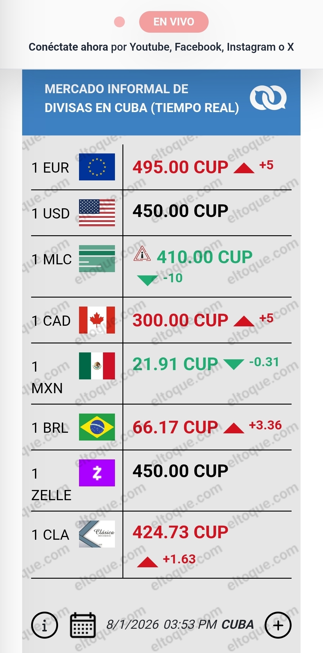 Este nuevo avance del euro confirma la presión sostenida sobre el peso cubano y refuerza el papel del mercado informal como principal termómetro económico del país, en un contexto marcado por la escasez de divisas, la inflación persistente y la falta de un mercado cambiario oficial funcional para la población.