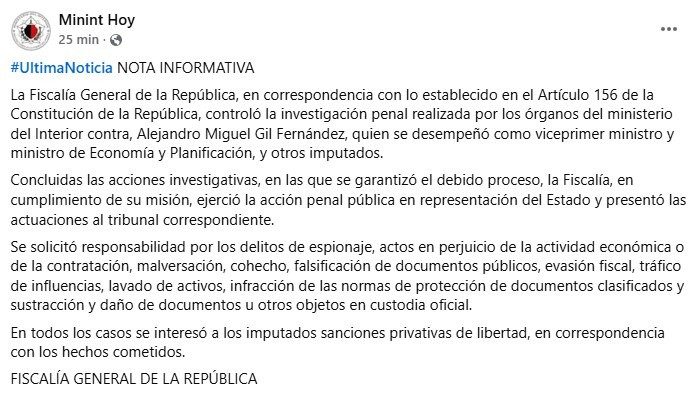 La Fiscalía General de la República de Cuba anunció que ejerció acción penal pública contra Alejandro Miguel Gil Fernández, ex viceprimer ministro y exministro de Economía y Planificación, junto a otros implicados en un proceso penal por graves delitos económicos y de seguridad.