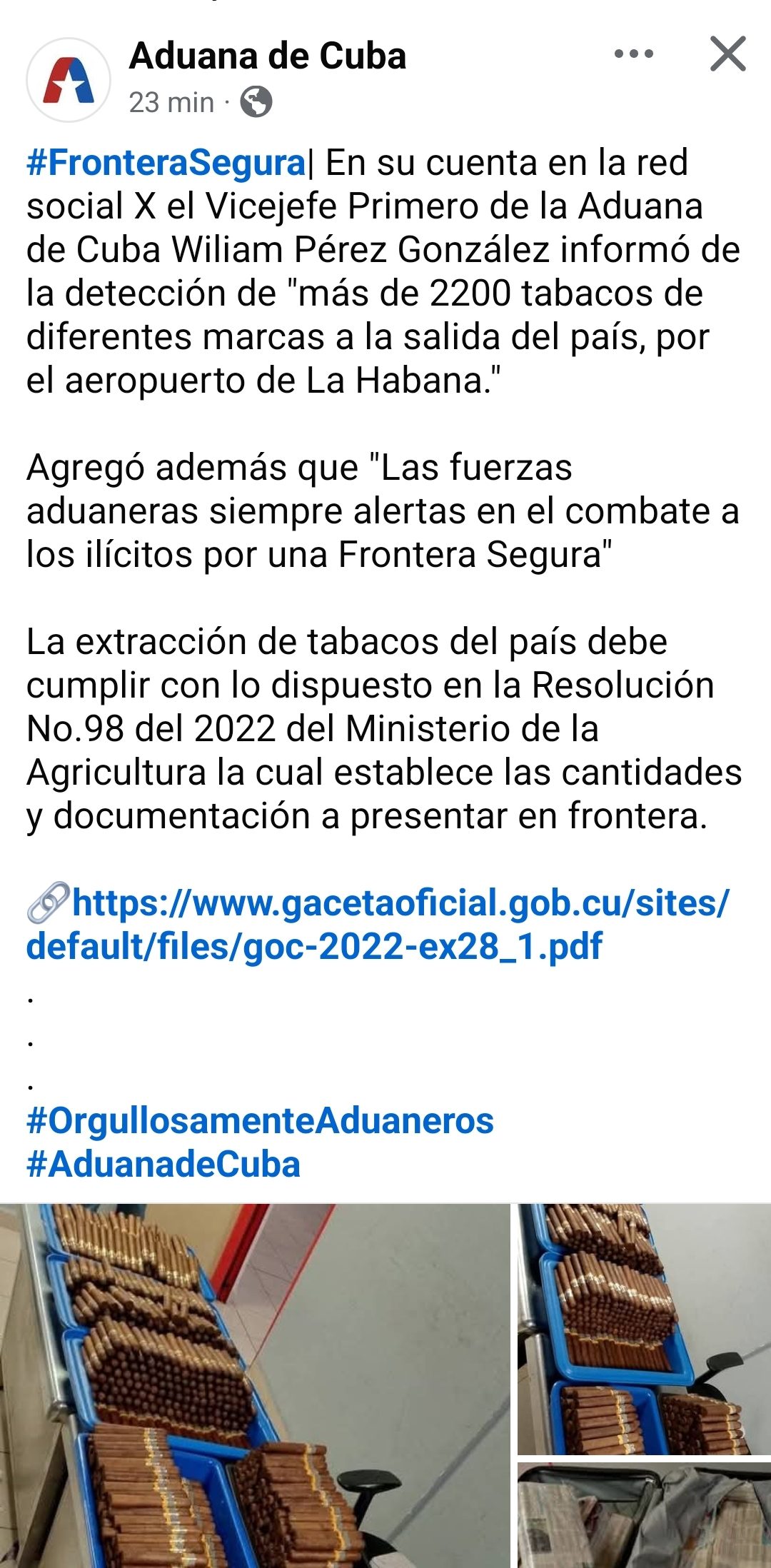 La Aduana recordó que la extracción de tabacos del país debe realizarse conforme a la Resolución No. 98 del 2022 del Ministerio de la Agricultura, documento que regula las cantidades permitidas y la documentación obligatoria para presentar ante las autoridades.