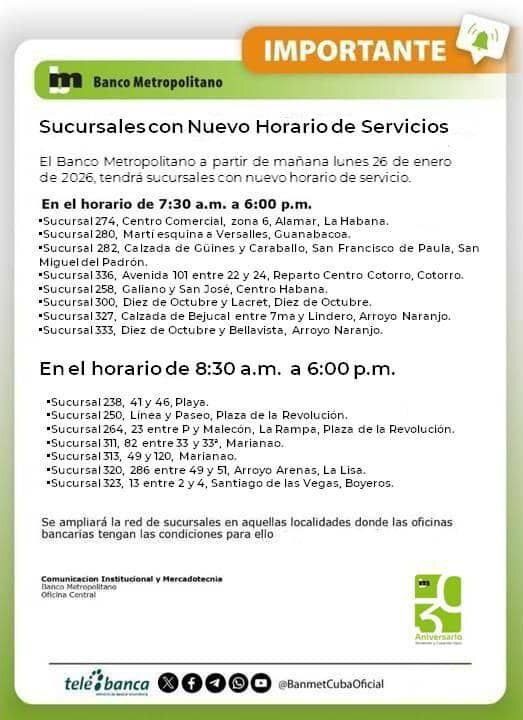 Por el momento, el Banco Metropolitano recomienda a los clientes verificar el horario específico de su sucursal antes de acudir, ya que no todas las oficinas de La Habana están incluidas en esta primera etapa.