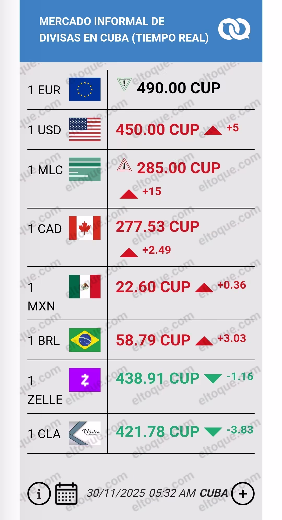 En contraste, el euro cae ligeramente hasta los 490 CUP y el Zelle disminuye hasta 438.91 CUP, aunque estos descensos no compensan el alza general de las demás divisas.