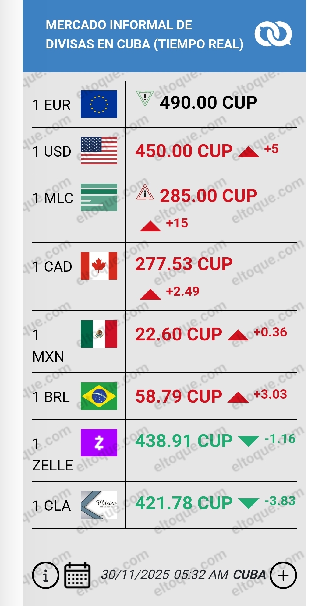 En contraste, el euro cae ligeramente hasta los 490 CUP y el Zelle disminuye hasta 438.91 CUP, aunque estos descensos no compensan el alza general de las demás divisas.