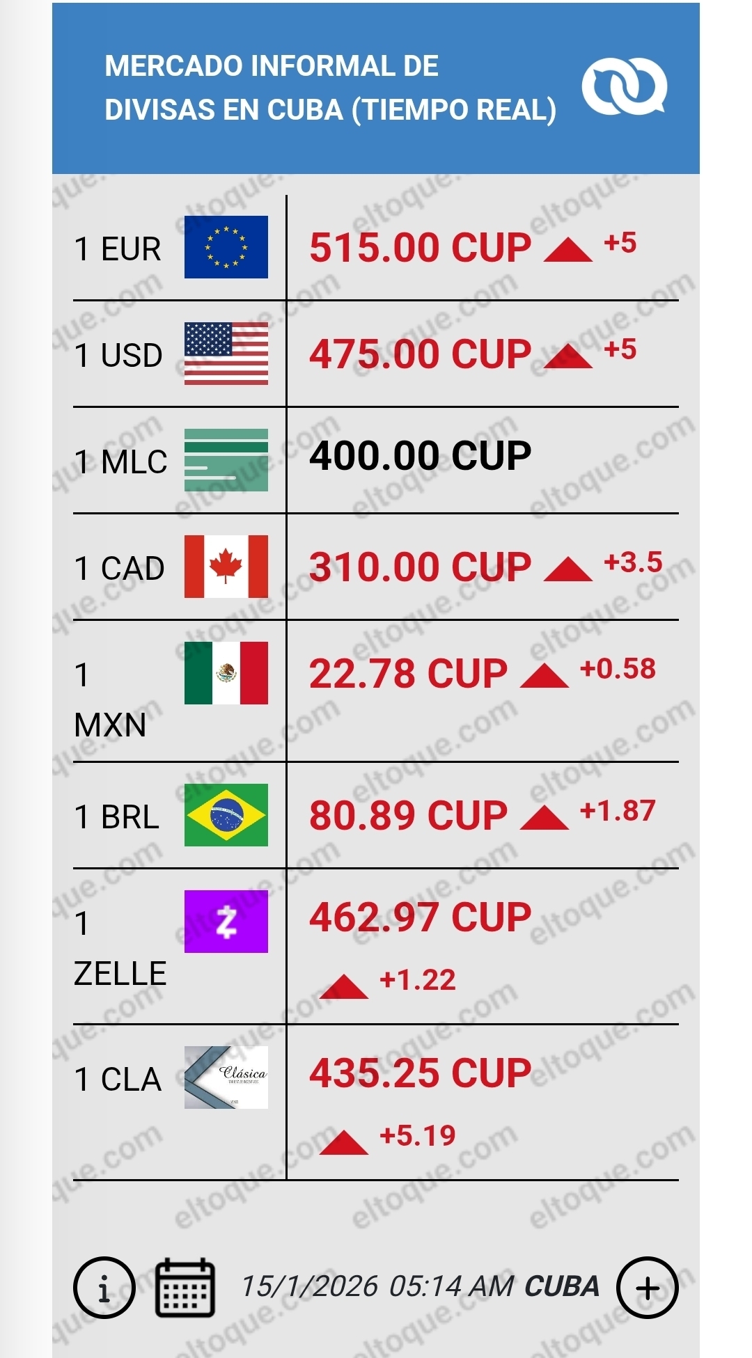 – 1 EUR = 515 CUP (+5)