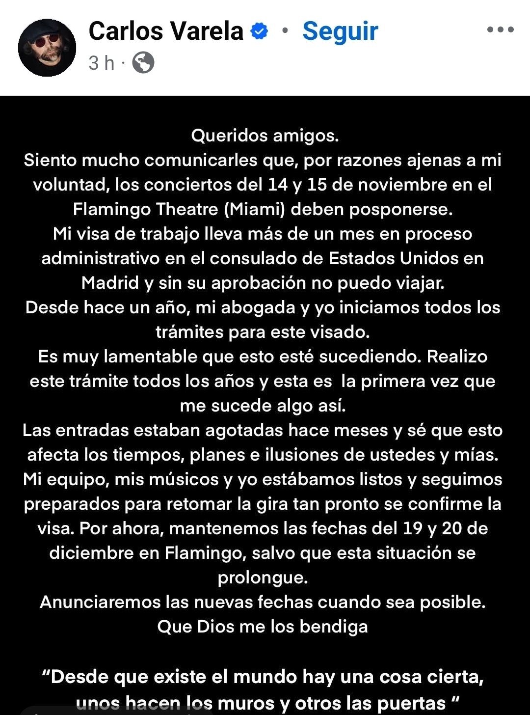 El cantautor cubano Carlos Varela, conocido por sus letras críticas y reflexivas, anunció que no podrá presentarse en los conciertos previstos para el 14 y 15 de noviembre en el Flamingo Theatre de Miami.