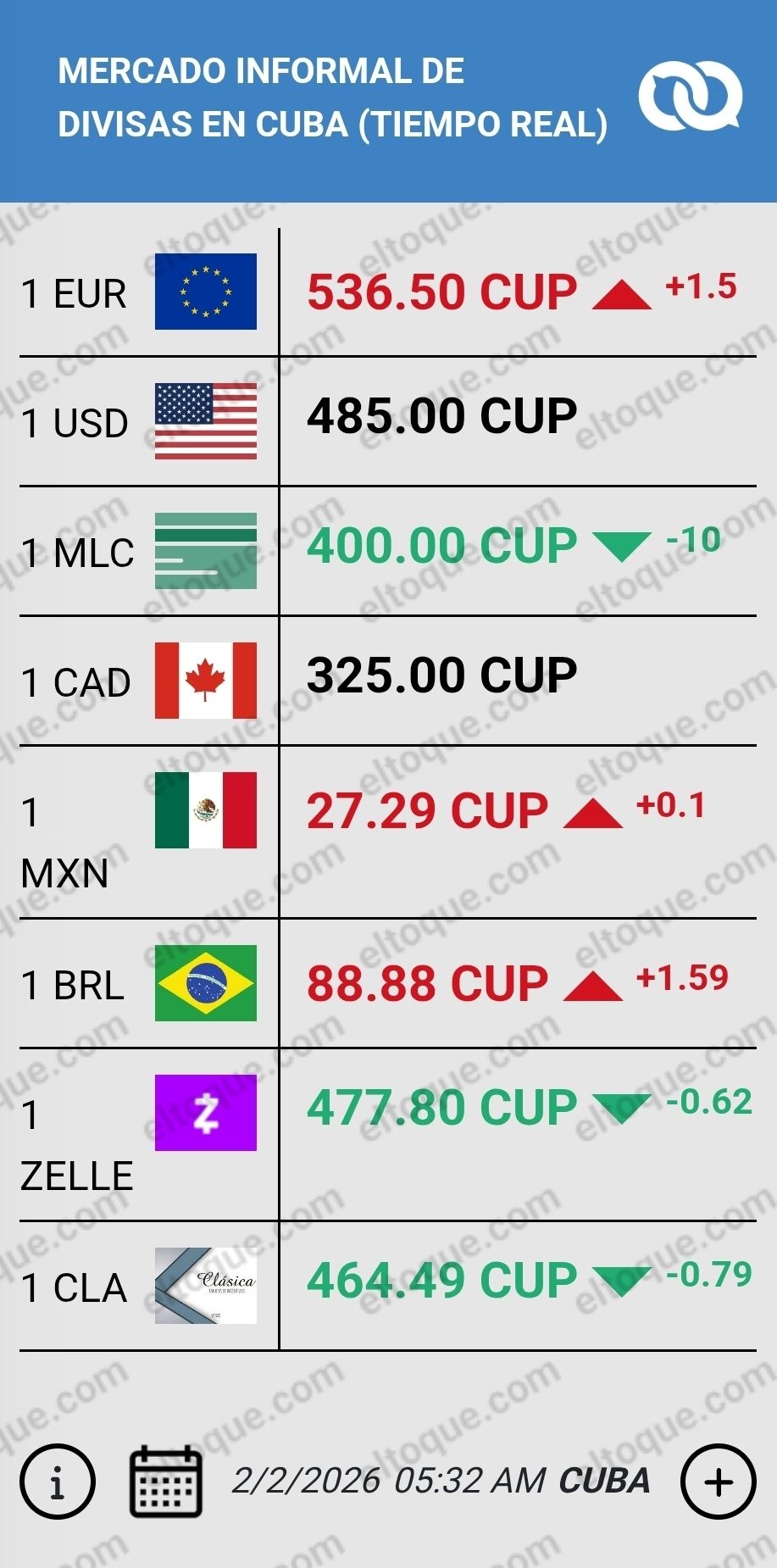 El mercado informal de divisas en Cuba amaneció este domingo 2 de febrero con movimientos diferenciados entre las principales monedas que circulan en la isla.Mientras el euro vuelve a encabezar las subidas y se acerca a nuevos máximos, la Moneda Libremente Convertible registra una caída visible.