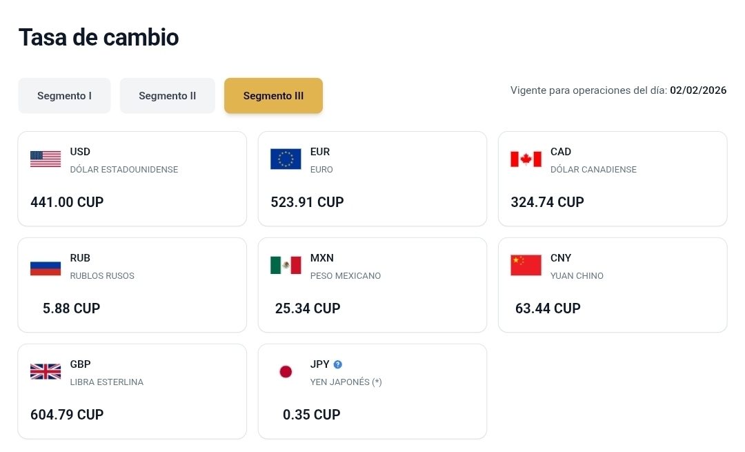 Este 2 de febrero, el dólar estadounidense se fija en 441.00 pesos cubanos y el euro en 523.91 pesos cubanos. La brecha con el mercado informal sigue ampliándose, especialmente en el caso del euro. De hecho, el euro supera en más de 12 pesos la referencia oficial.