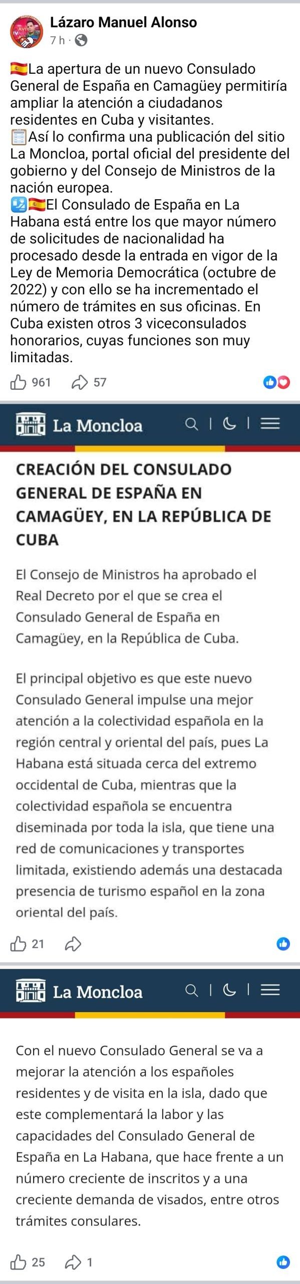 El Consejo de Ministros aprobó el Real Decreto que crea el Consulado General de España en Camagüey. La decisión fue publicada en el portal oficial de La Moncloa. El nuevo consulado tendrá rango general y se ubicará en la región central de Cuba.